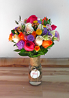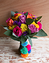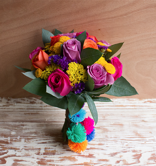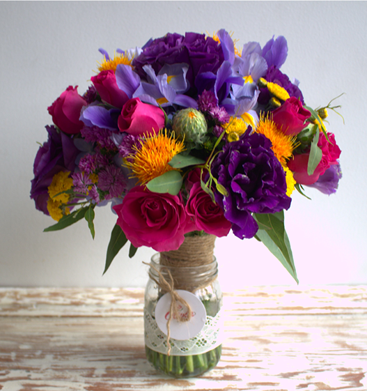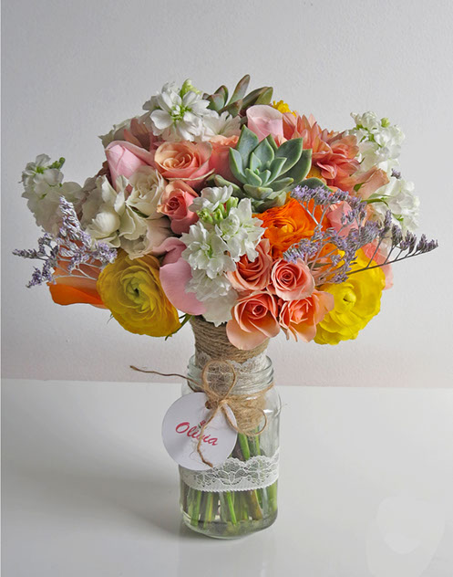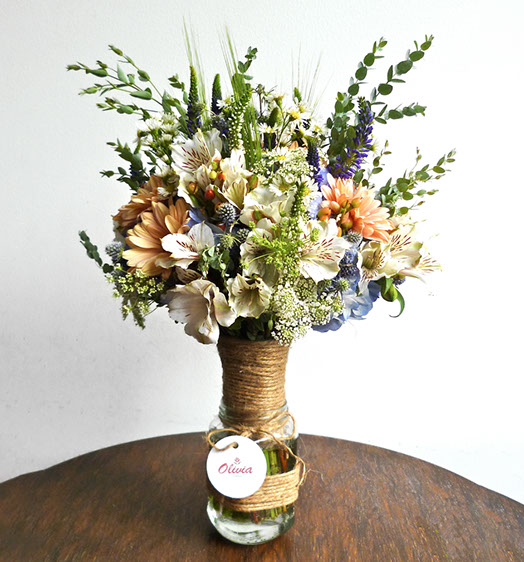 Composición de colores alegres y cálidos a la vez. Nos da la sensación de una mañana soleada de campo, donde recogemos las flores para armar el bouquet ideal.